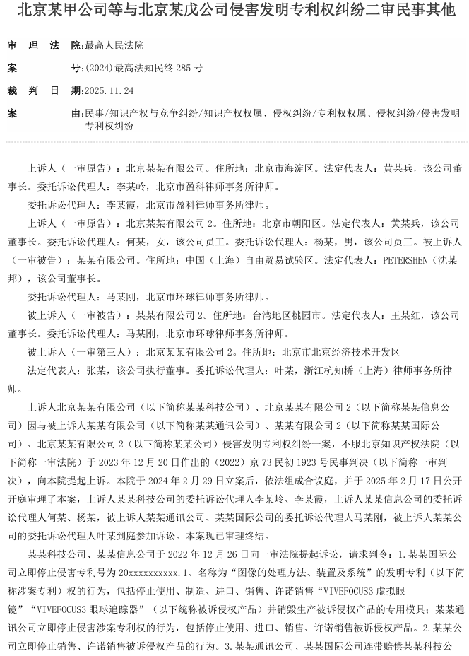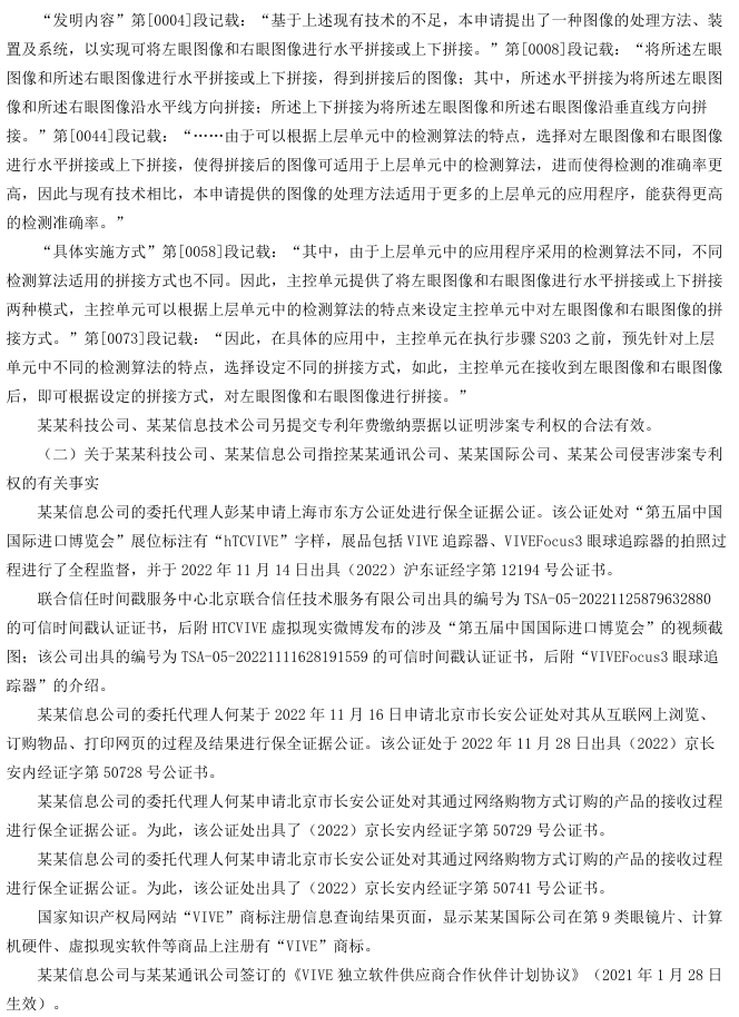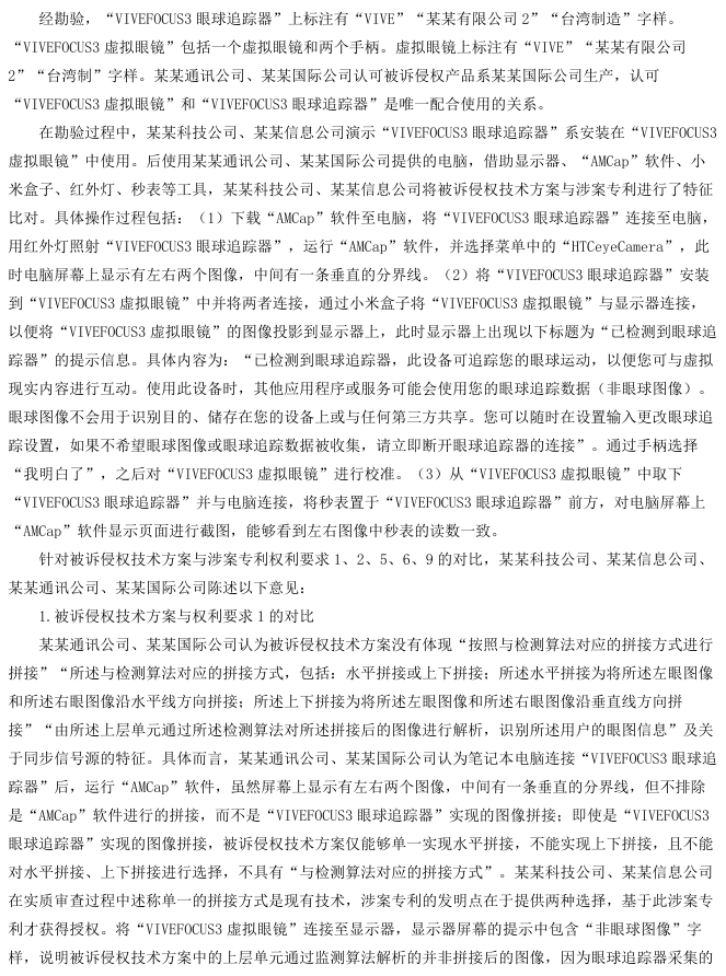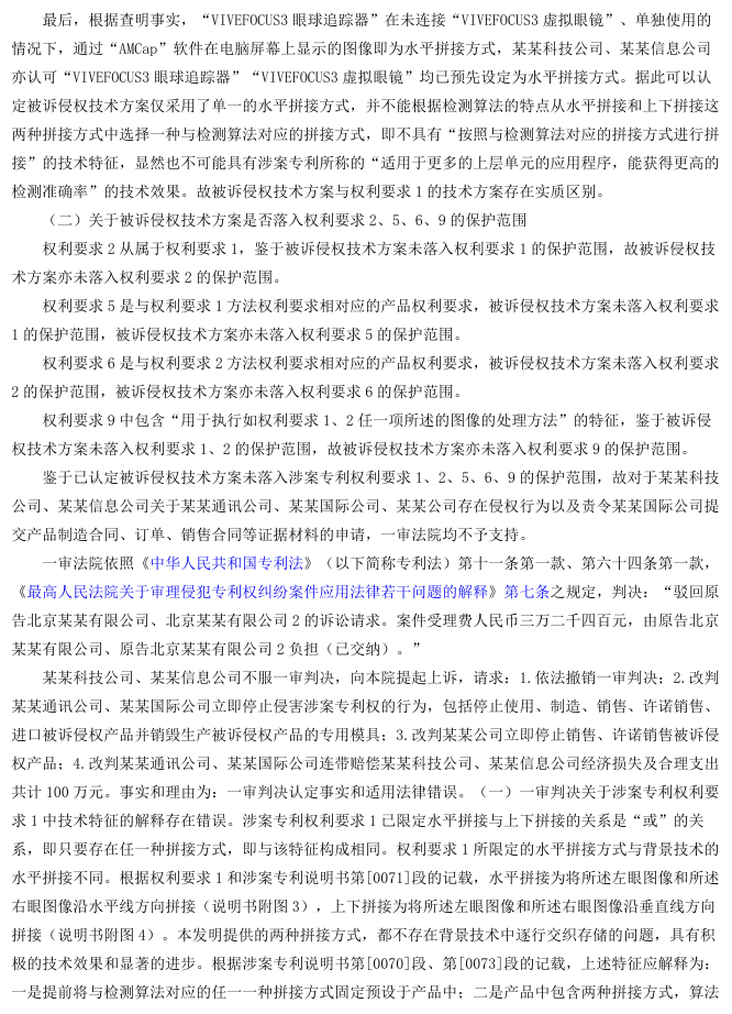 上诉人北京某某有限公司(以下简称某某科技公司)、北京某某有限公司2(以下简称某某信息公司)系发明专利“图像的处理方法、装置及系统”的专利权人。其认为,由某某有限公司(以下简称某某通讯公司)、某某有限公司2(以下简称某某国际公司)制造、销售的“VIVEFOCUS3虚拟眼镜”及“VIVEFOCUS3眼球追踪器”的技术方案落入其涉案专利权利要求1的保护范围,构成专利侵权,遂诉请停止侵权并赔偿损失。一审法院认定被诉侵权技术方案未落入专利权保护范围,驳回其诉讼请求。某某科技公司、某某信息公司不服,提起上诉。