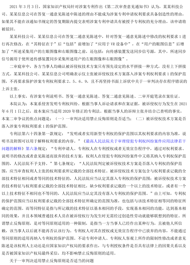 最高人民法院经审理认定,首先,关于“禁止反悔原则”的适用,某某科技公司、某某信息公司在涉案专利的实质审查阶段,为克服创造性缺陷,对权利要求作出了限缩性修改,并明确陈述“单一的眼部图像拼接方式才是本领域的常规操作”。该修改和陈述是为了获得授权而放弃的保护内容,在侵权诉讼中不得再行主张。一审法院适用该原则正确。