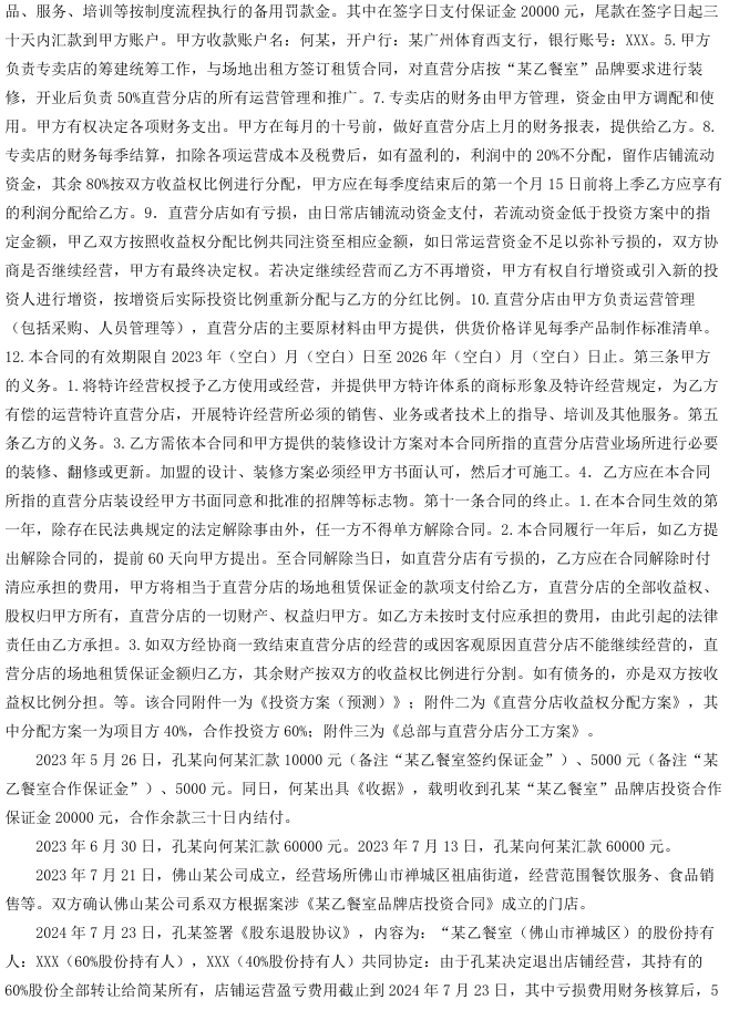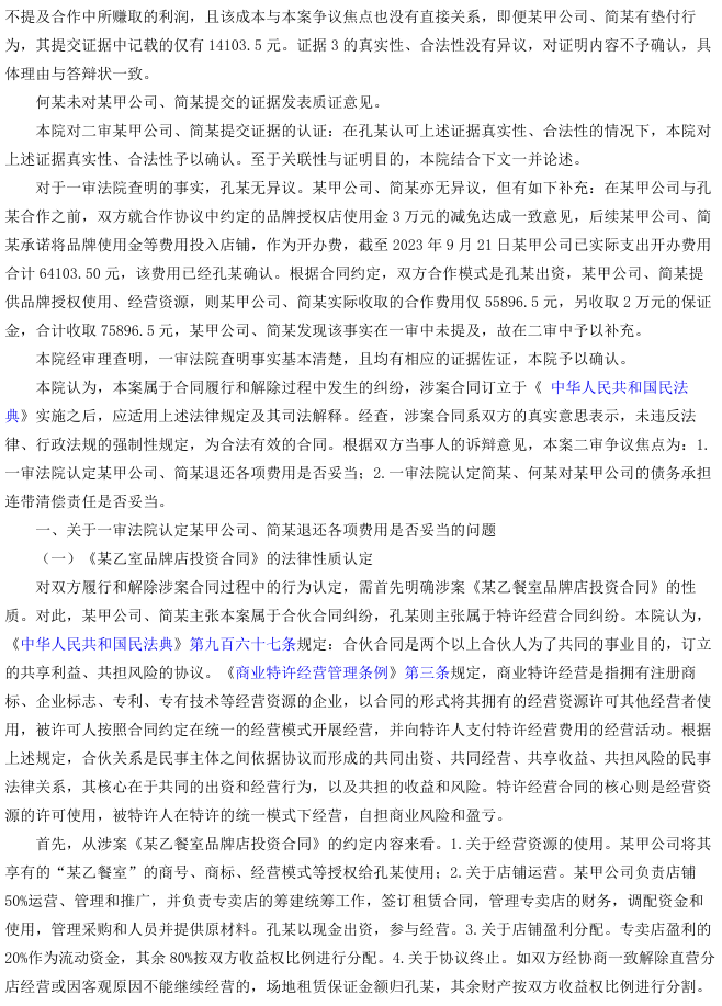 孔某与广州市某有限公司(简称“某甲公司”)签订《某乙餐室品牌店投资合同》,约定共同投资经营“花姐餐室”直营分店。合作期间,双方实际共同出资、共同经营、共担盈亏。后孔某退出经营,双方签订《股东退股协议》,明确股权转让、亏损分担等事宜。因某甲公司未返还相关费用,孔某诉至法院,要求返还品牌使用费、食品配方使用费、租赁及物业保证金,并由公司股东简某、何某承担连带责任。