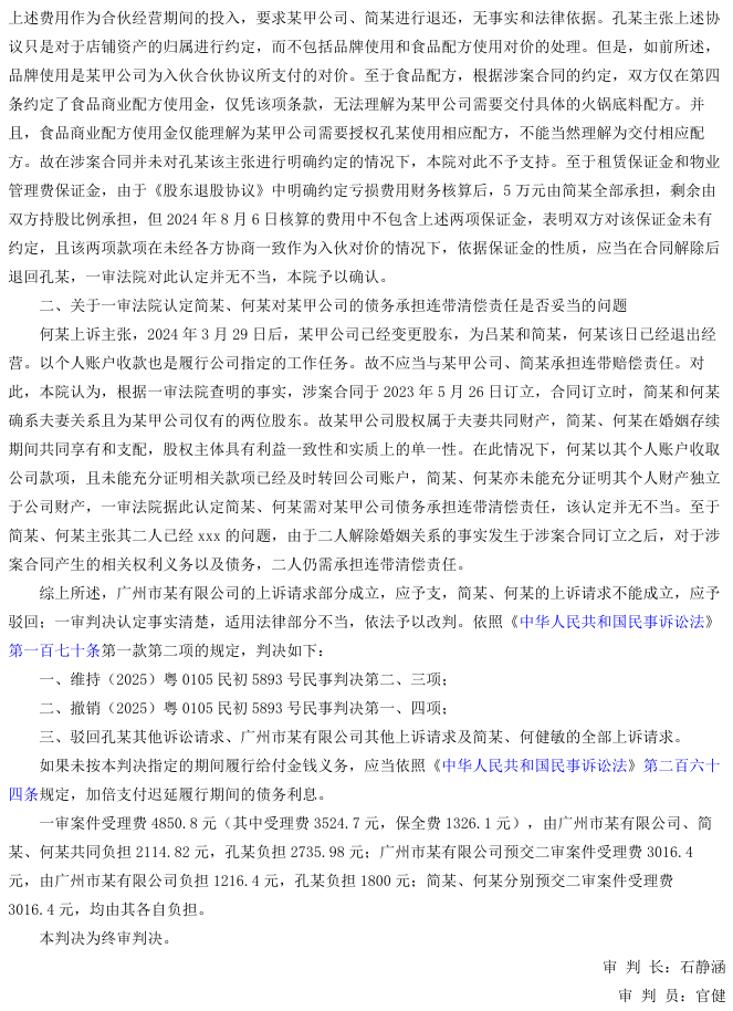 二审法院认为双方合同虽名为投资,但实质构成合伙关系,品牌及配方使用费属于合伙投入。双方已通过《股东退股协议》完成盈亏清算,该费用不再予以返还;租赁及物业保证金未纳入清算范围,依据保证金性质仍应退还。此外,简某与何某在合同订立期间系夫妻且共同持有公司全部股权,二人以个人账户收取公司款项,未能证明财产独立,构成财产混同,依法应对公司债务承担连带清偿责任。最终,法院部分改判一审判决,支持返还保证金,维持股东连带责任,驳回其他诉讼请求。