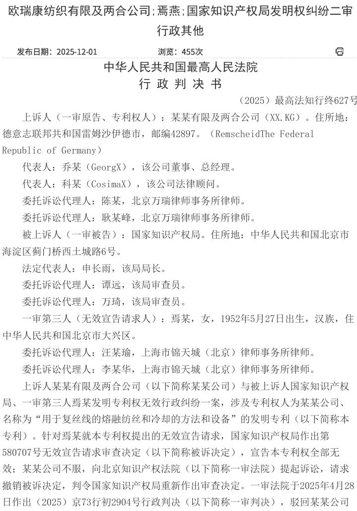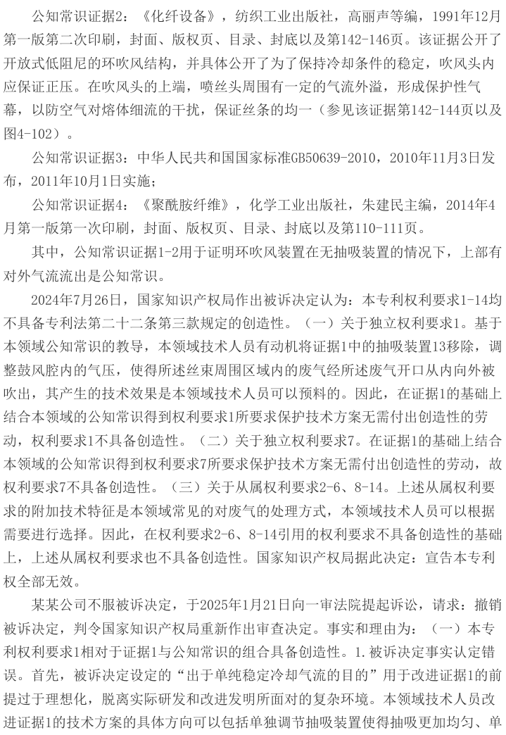 2025年11月24日,最高人民法院就专利无效行政纠纷作出终审判决: 被诉专利“用于复丝线的熔融纺丝和冷却的方法和设备”在证据1(DE102013012869A1)的基础上,结合本领域公知常识(《化纤厂空气调节》《化纤设备》等),其权利要求1所要保护的技术方案对本领域技术人员而言是显而易见的,不具备创造性。鉴于专利权人某某公司亦确认在权利要求1不具备创造性的前提下,不再坚持其他权利要求的创造性,因此被诉决定及一审判决宣告本专利权全部无效并无不当。最终,最高人民法院驳回上诉,维持原判。