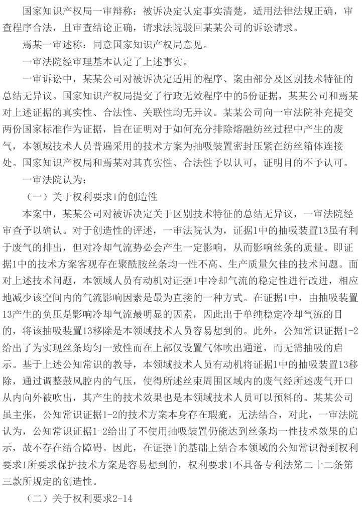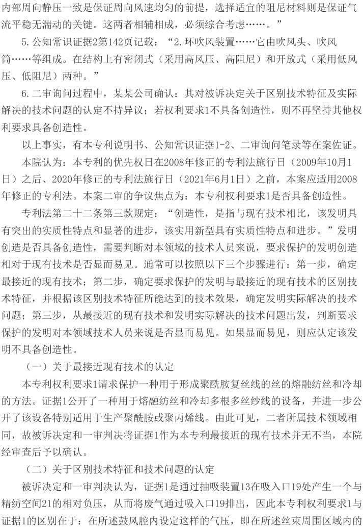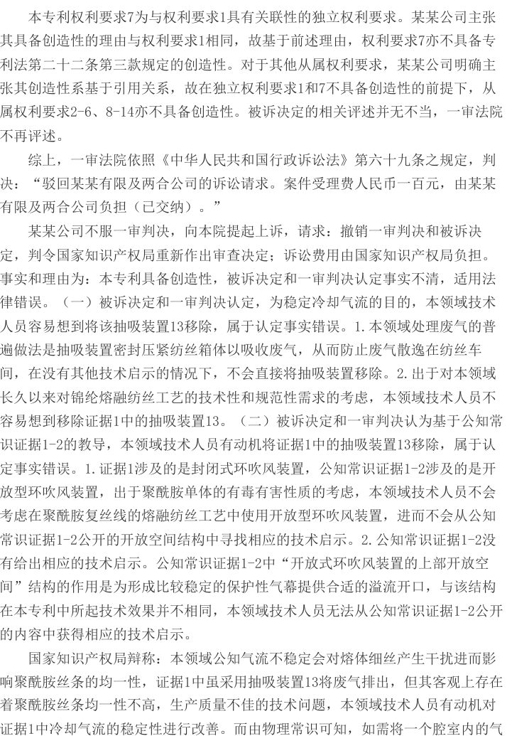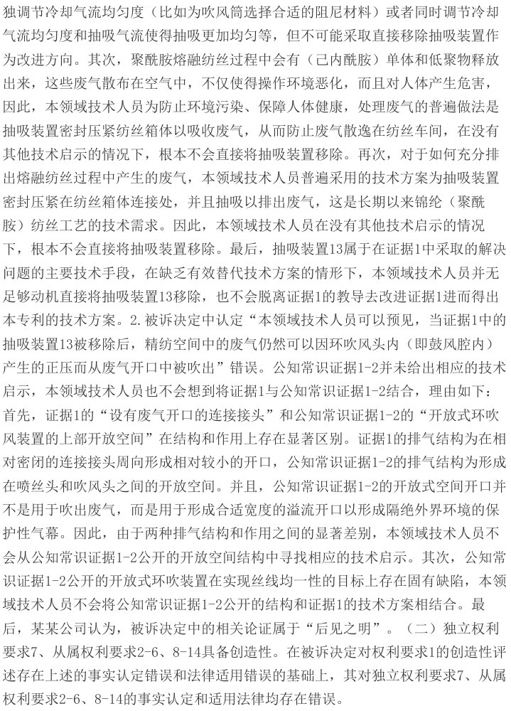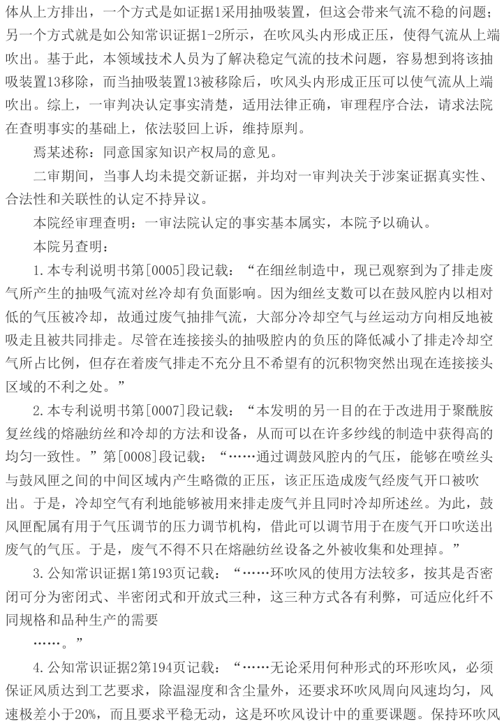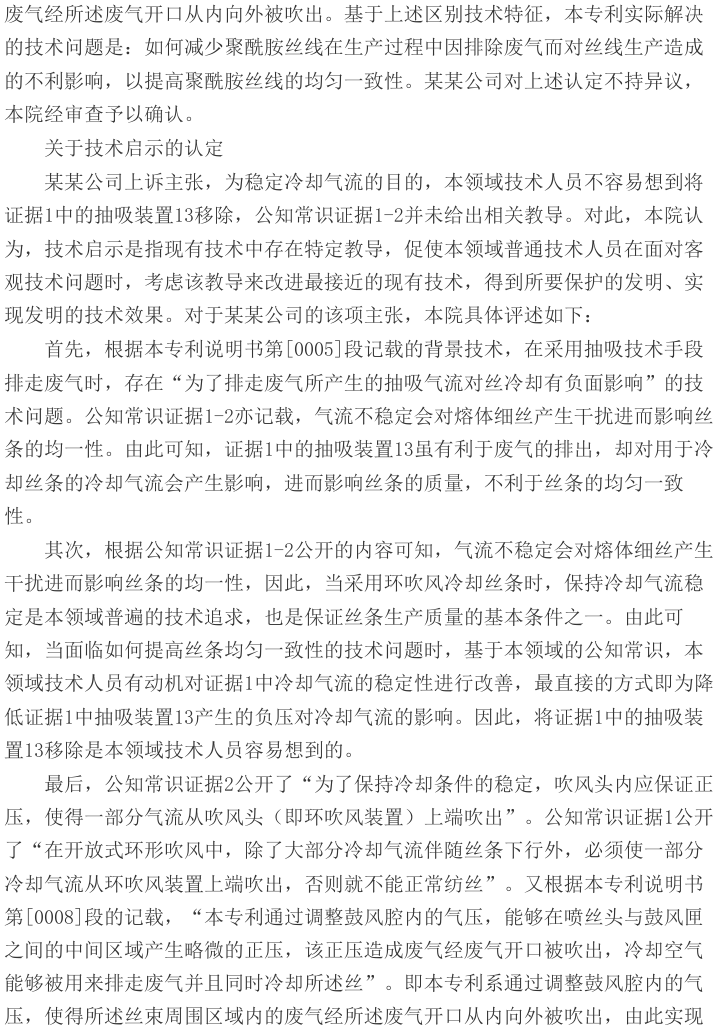 最高院认定, 证据1公开了通过抽吸装置负压排出废气的技术方案,但该抽吸装置会影响冷却气流的稳定性,进而影响丝条均匀性。公知常识证据已明确,保持冷却气流稳定是保证丝条质量的基本要求,并教导了可通过在吹风头内形成正压使气流从上端吹出的技术手段。因此,本领域技术人员在面对提高丝条均匀性的技术问题时,有动机移除证据1中的抽吸装置,并通过调整鼓风腔气压使废气从内向外吹出,该技术效果是可预料的。被诉决定和一审判决关于本专利权利要求1不具备创造性的认定正确。鉴于某某公司对权利要求1不具备创造性无异议后,不再坚持其他权利要求的创造性,故对其他权利要求的无效认定予以确认。最终,最高院驳回上诉,维持原判。