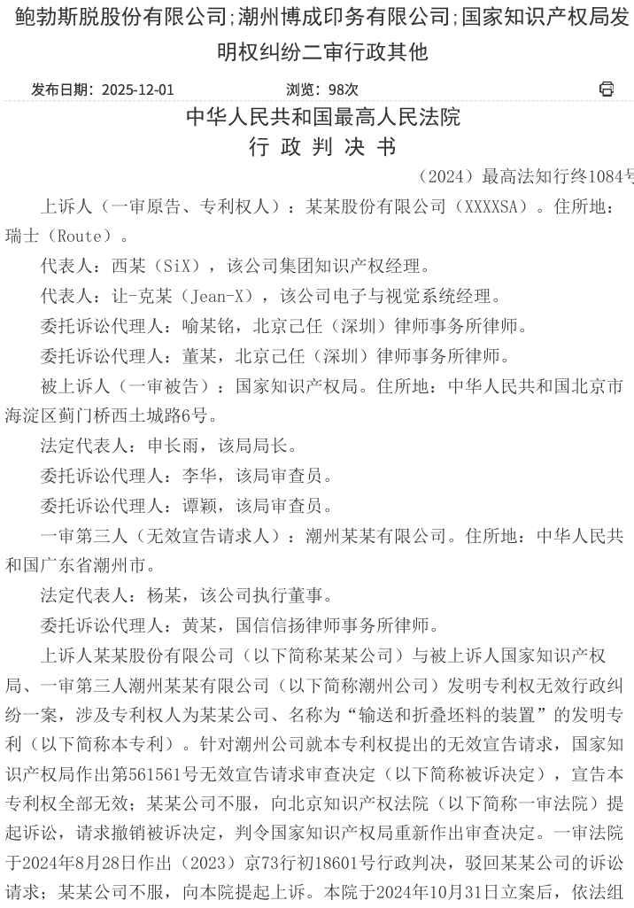 2025年11月24日,最高人民法院就专利无效行政纠纷作出终审判决: 被诉专利“用于复丝线的熔融纺丝和冷却的方法和设备”在证据1(DE102013012869A1)的基础上,结合本领域公知常识(《化纤厂空气调节》《化纤设备》等),其权利要求1所要保护的技术方案对本领域技术人员而言是显而易见的,不具备创造性。鉴于专利权人某某公司亦确认在权利要求1不具备创造性的前提下,不再坚持其他权利要求的创造性,因此被诉决定及一审判决宣告本专利权全部无效并无不当。最终,最高人民法院驳回上诉,维持原判。