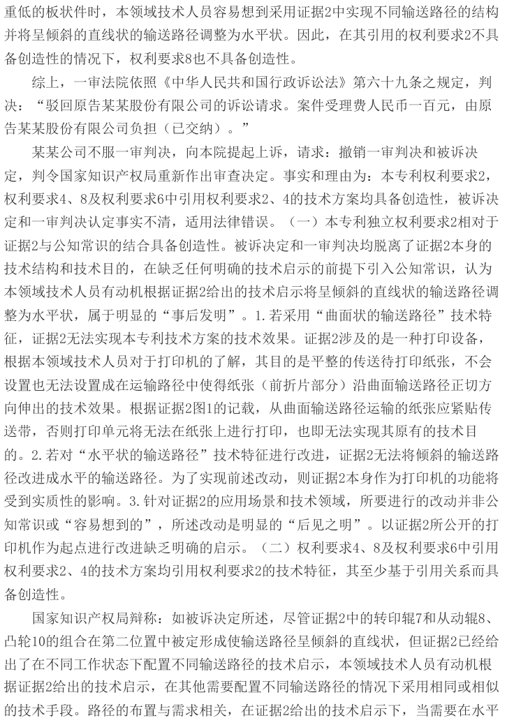 某某公司不服,向北京知识产权法院提起诉讼,请求撤销被诉决定。一审法院经审理认为,在证据1的基础上结合本领域公知常识,得到本专利权利要求1的技术方案是显而易见的,故权利要求1不具备创造性;在独立权利要求1不具备创造性的前提下,从属权利要求及另一独立权利要求7亦不具备创造性。据此,一审法院判决驳回某某公司的诉讼请求。
