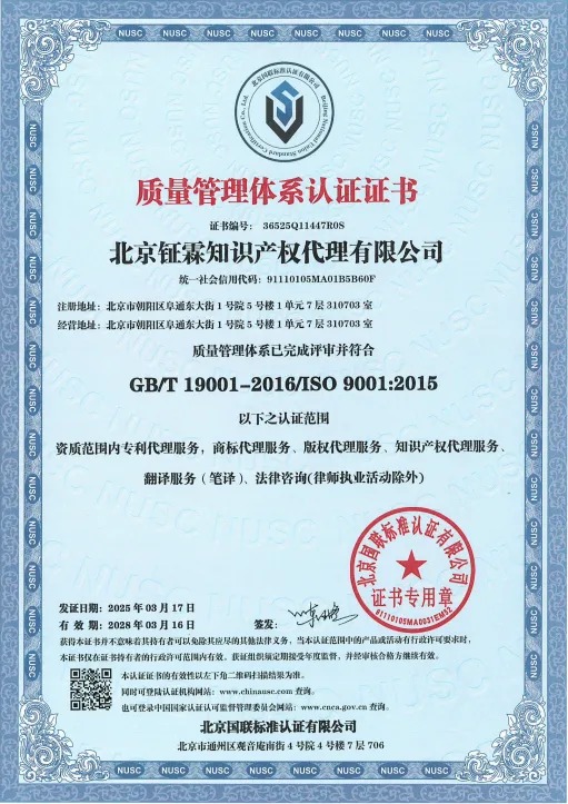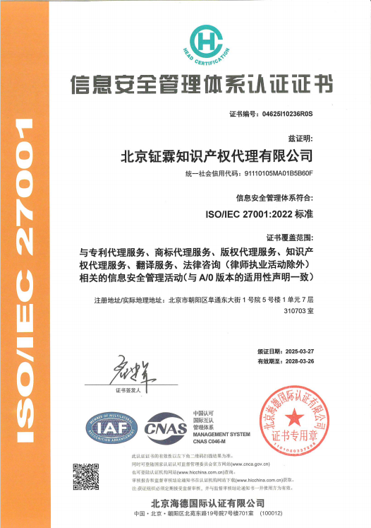 钲霖知产获得由北京联合标准认证有限公司(Beijing National Union Standard Certification Co., Ltd.)颁发的IS0 9001质量管理体系认证和北京海德国际认证有限公司(Head International Certification)颁发的 ISO 27001信息安全管理体系认证的两项国际权威证书。这不仅是对钲霖知产服务能力的权威认可,更标志着钲霖知产在信息安全保障与服务质量管控上迈入国际化、标准化的全新阶段。