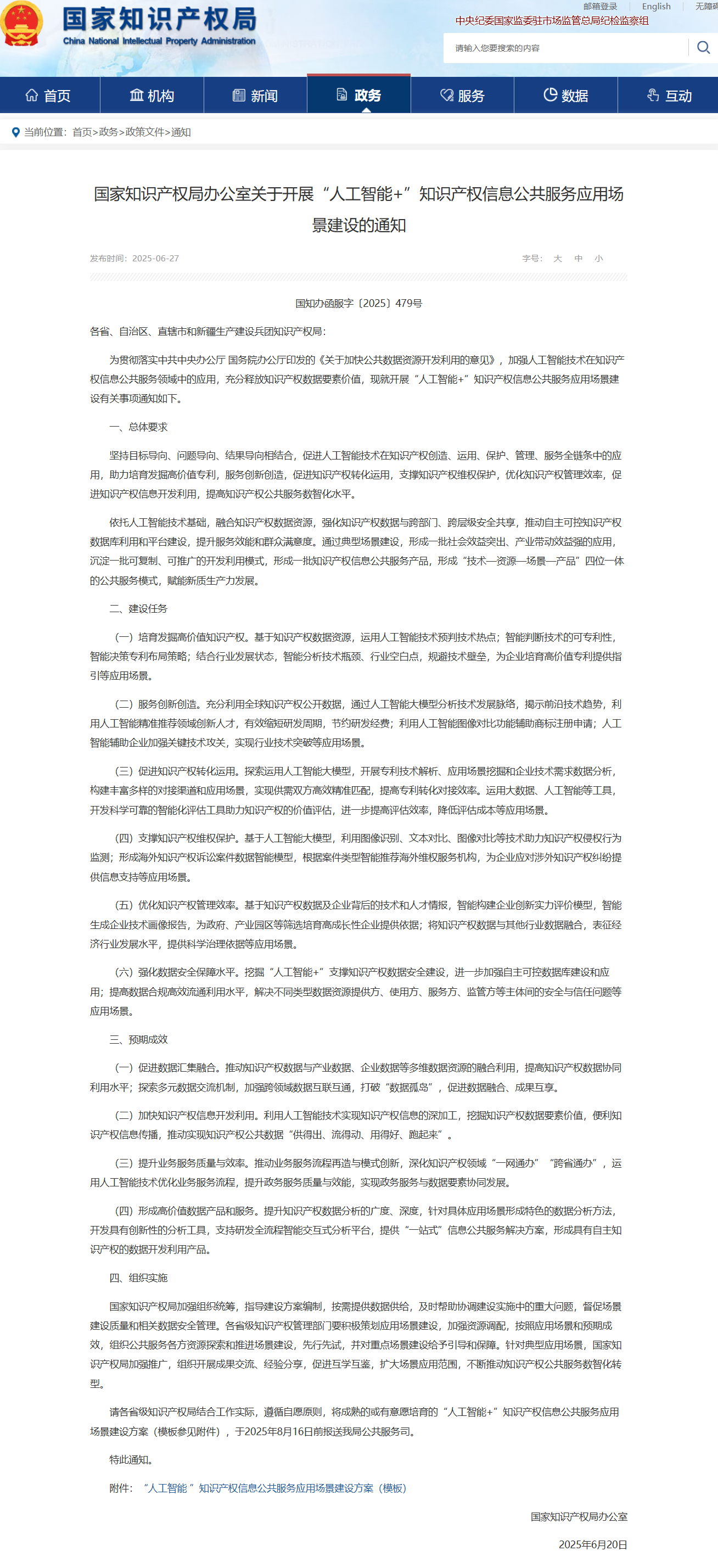 请各省级知识产权局结合工作实际,遵循自愿原则,将成熟的或有意愿培育的“人工智能+”知识产权信息公共服务应用场景建设方案(模板参见附件),于2025年8月16日前报送我局公共服务司。