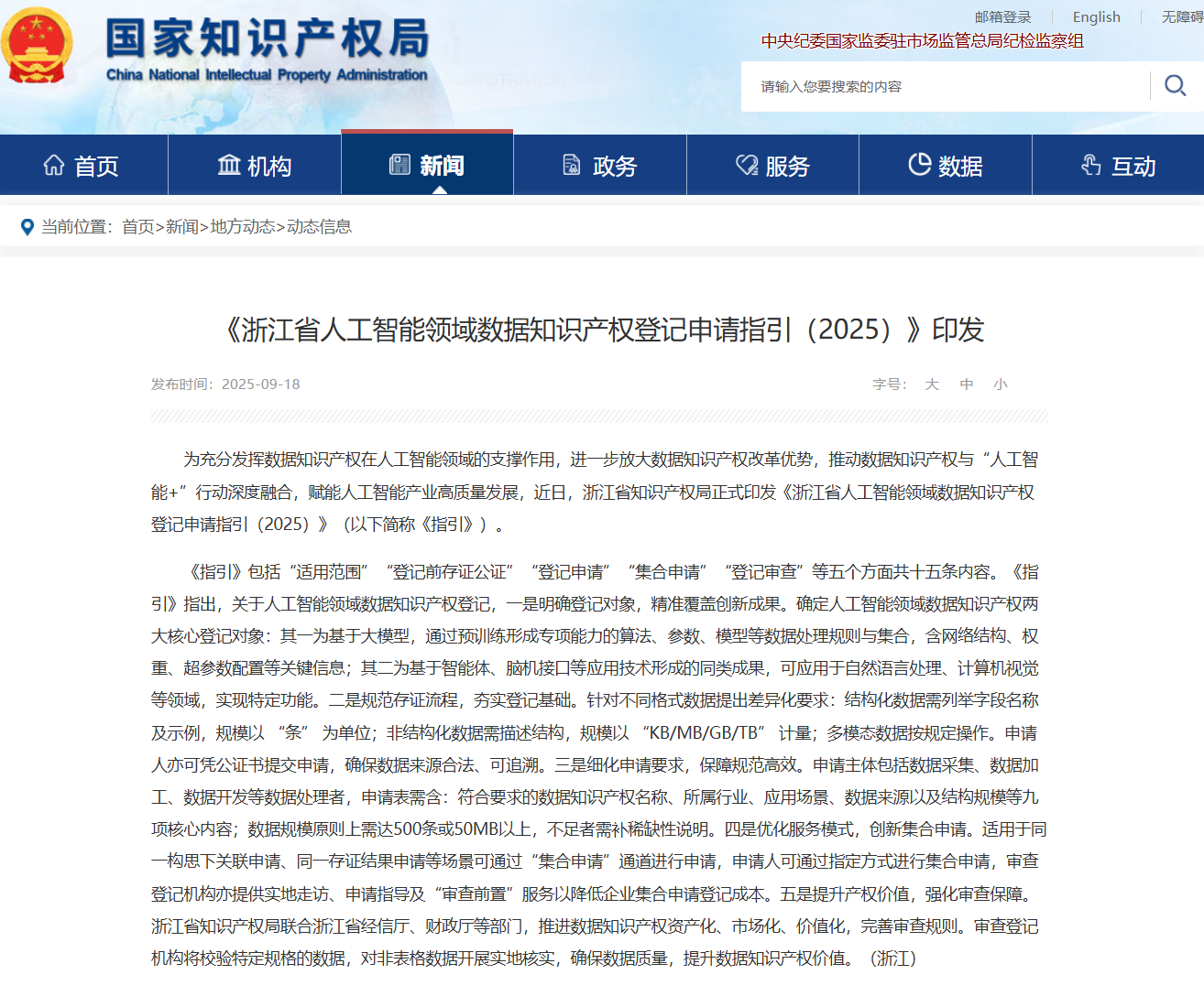 为充分发挥数据知识产权在人工智能领域的支撑作用,进一步放大数据知识产权改革优势,推动数据知识产权与“人工智能+”行动深度融合,赋能人工智能产业高质量发展,近日,浙江省知识产权局正式印发《浙江省人工智能领域数据知识产权登记申请指引(2025)》(以下简称《指引》)。