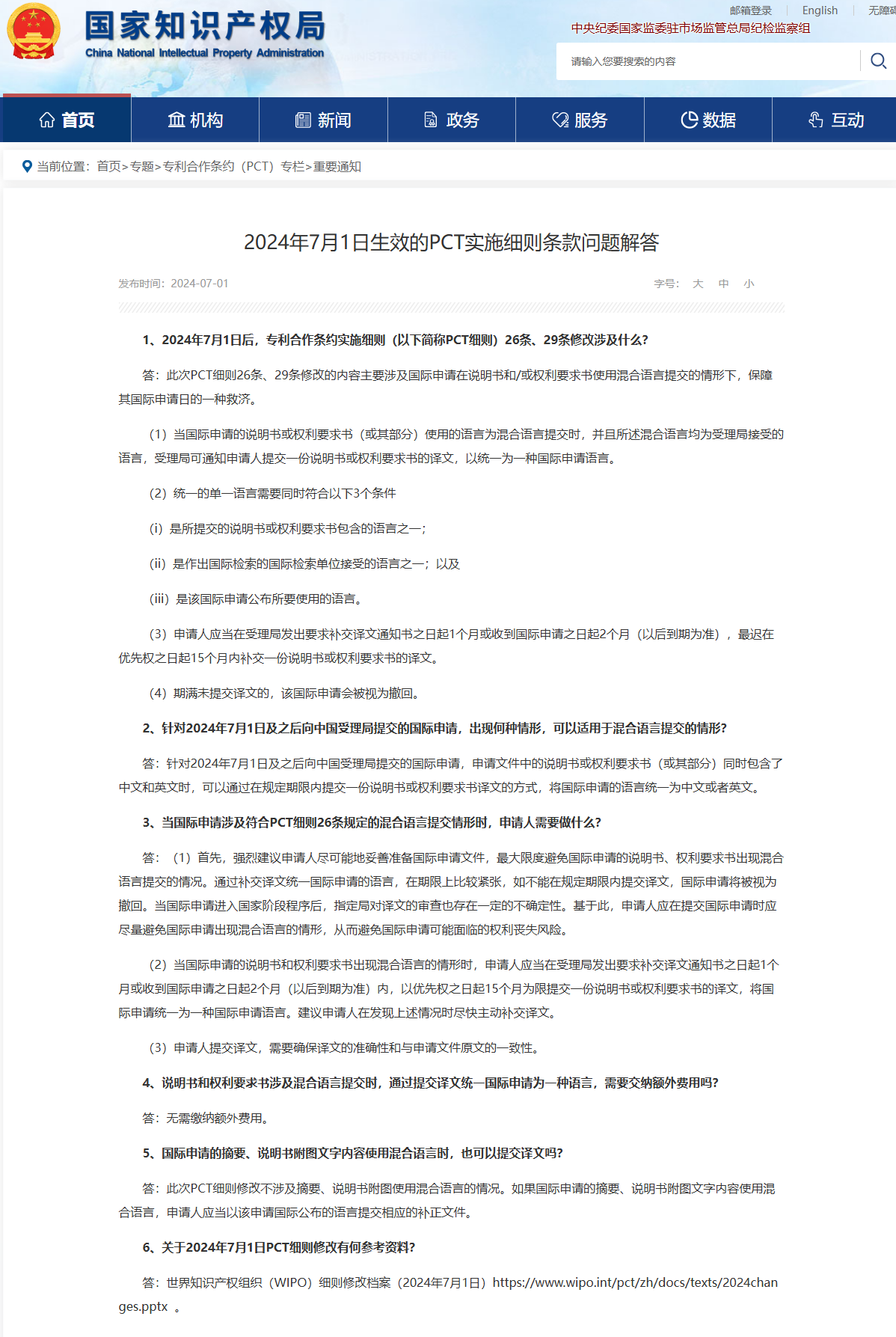 答:世界知识产权组织(WIPO)细则修改档案(2024年7月1日)https://www.wipo.int/pct/zh/docs/texts/2024changes.pptx 。
