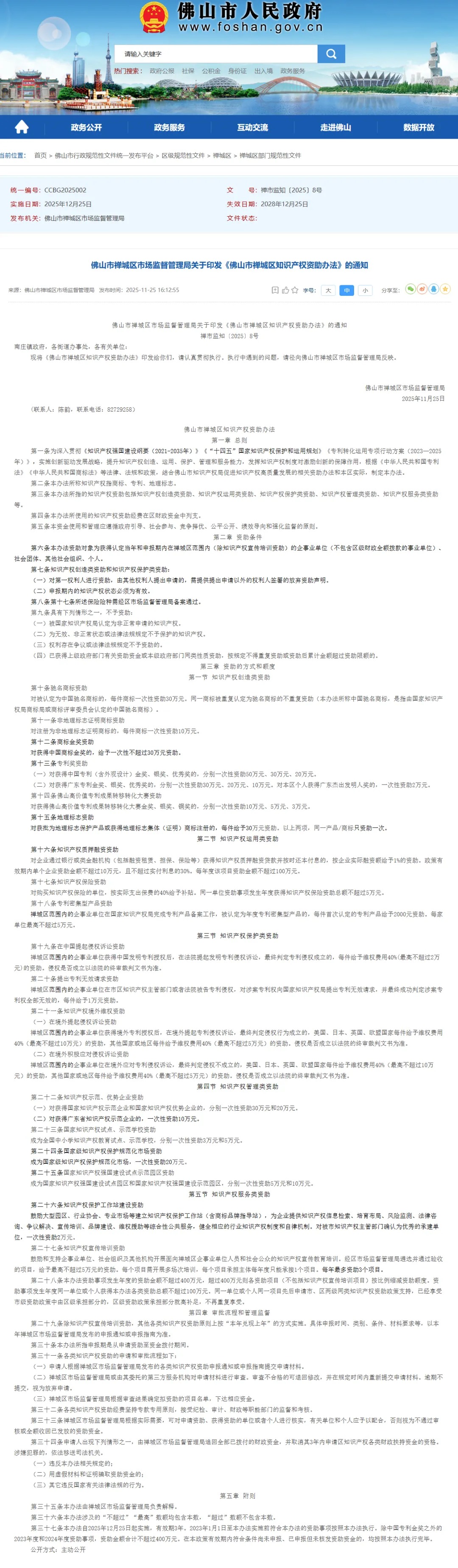 禅城区范围内的企事业单位在市区知识产权主管部门或者法院被告专利侵权,对涉案专利权向国家知识产权局提出专利无效请求,并最终成功判定涉案专利权全部无效的,每件给予1万元资助。