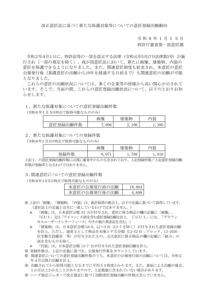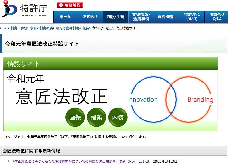2020年4月1日,日本《专利法》等部分修订法(2019年5月17日法律第3号)正式施行(部分条款除外),《设计法》新增了对图像、建筑物及室内装饰设计的保护范围。同时,关联设计制度也得到完善,在主设计公告发布后(至基础设计申请日起满10年前),仍可申请关联设计。