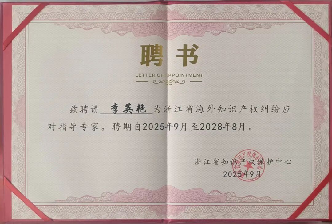 喜迎佳音!近日,钲霖知产所长李英艳女士凭借专业建树和深厚经验,正式受聘为浙江省海外知识产权纠纷应对指导专家。