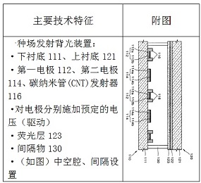 对比文件1(CN1637511A)公开了一种场发射背光装置、背光装置驱动方法及制造下面板的方法。并具体公开了:下衬底111、上衬底121,第一电极112、第二电极114、碳纳米管(CNT)发射器116,对电极分别施加预定的电压(驱动),荧光层123,间隔物130等特征。
