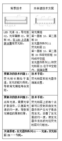 经过重新理解本申请可以看出,本申请要求保护的方案的技术实质是,对传统线光源和点光源如发光器件阵列进行的改进,其采用发光器件阵列发出光子而发光,并激发荧光粉层发光,从而达到发光均匀的效果,也就是说,即使没有荧光粉层本案的背光模组也能发出光,荧光粉层的作用只是通过与能够发光的元件即发光器件配合改进发光效果和简化结构。简单来说,本申请的关键原理是:发光器件阵列11是用于发光的光源,而荧光粉层21是用于匀光。