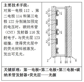 通过全面理解对比文件1可知,对比文件1中的荧光层123是发光元件中的一个构成部分,它与第一电极112、第二电极114、第三电极122和碳纳米管发射器116相互配合用于发光,也就是说,它们共同组成了对比文件1的技术方案中的光源。