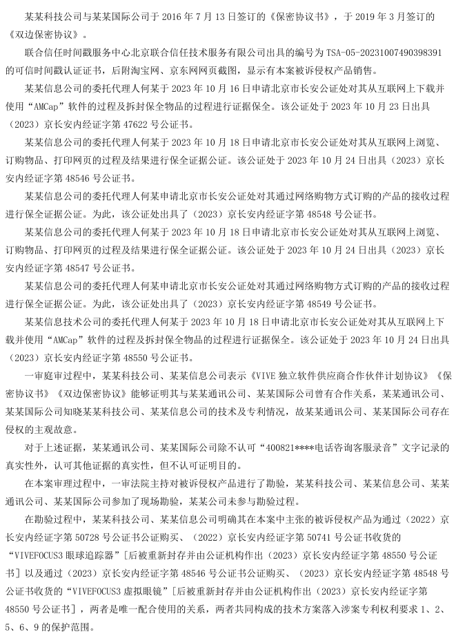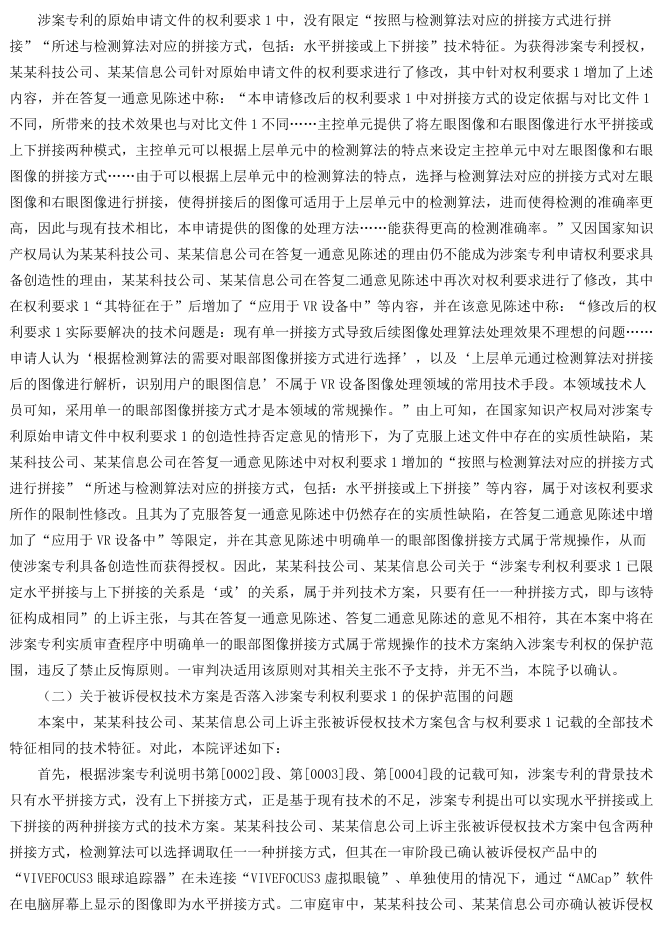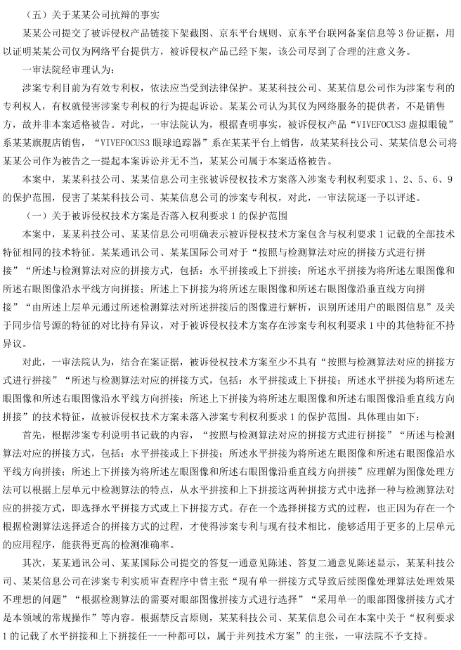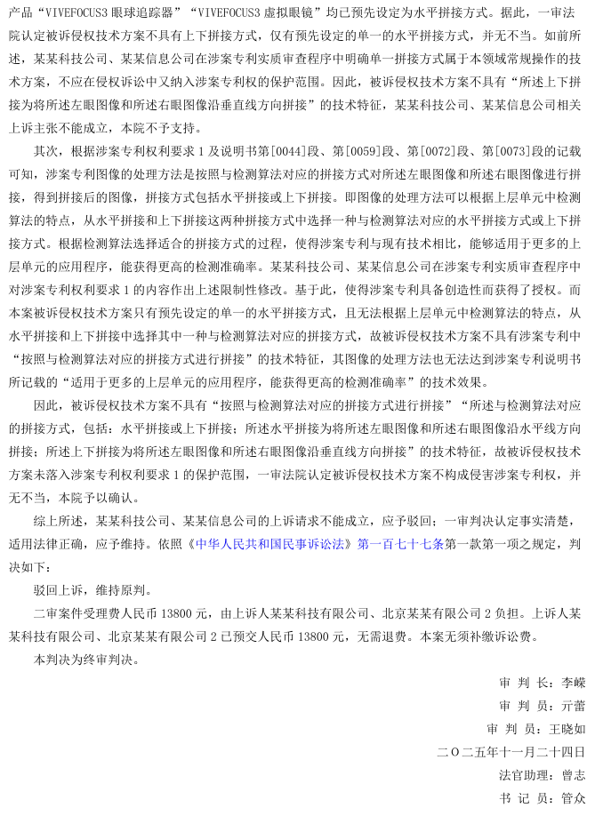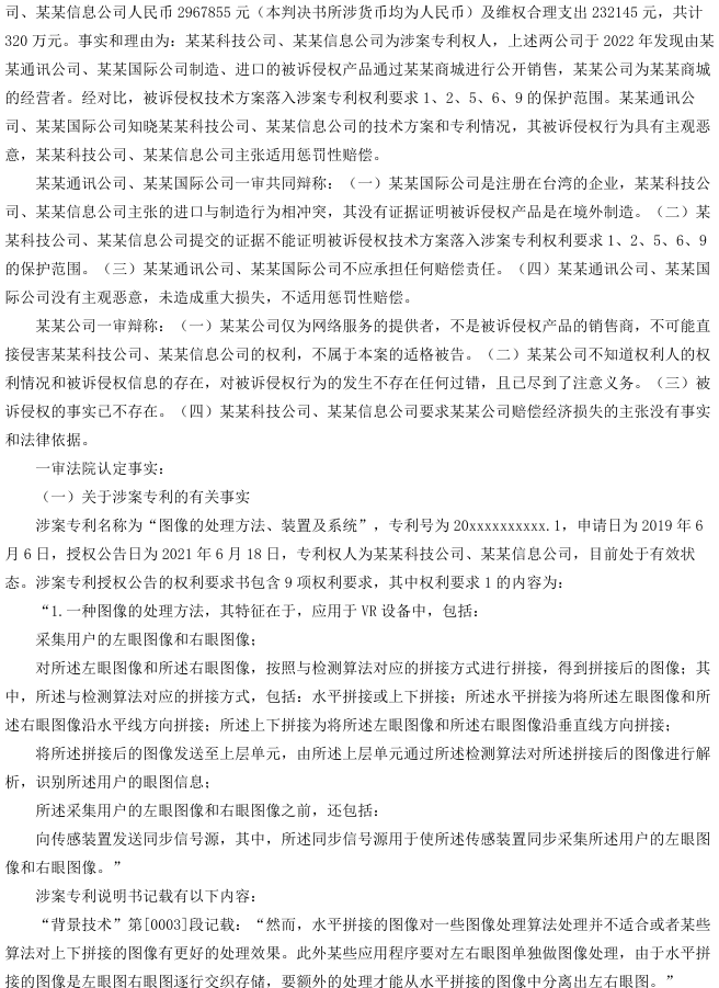 上诉人北京某某有限公司(以下简称某某科技公司)、北京某某有限公司2(以下简称某某信息公司)系发明专利“图像的处理方法、装置及系统”的专利权人。其认为,由某某有限公司(以下简称某某通讯公司)、某某有限公司2(以下简称某某国际公司)制造、销售的“VIVEFOCUS3虚拟眼镜”及“VIVEFOCUS3眼球追踪器”的技术方案落入其涉案专利权利要求1的保护范围,构成专利侵权,遂诉请停止侵权并赔偿损失。一审法院认定被诉侵权技术方案未落入专利权保护范围,驳回其诉讼请求。某某科技公司、某某信息公司不服,提起上诉。