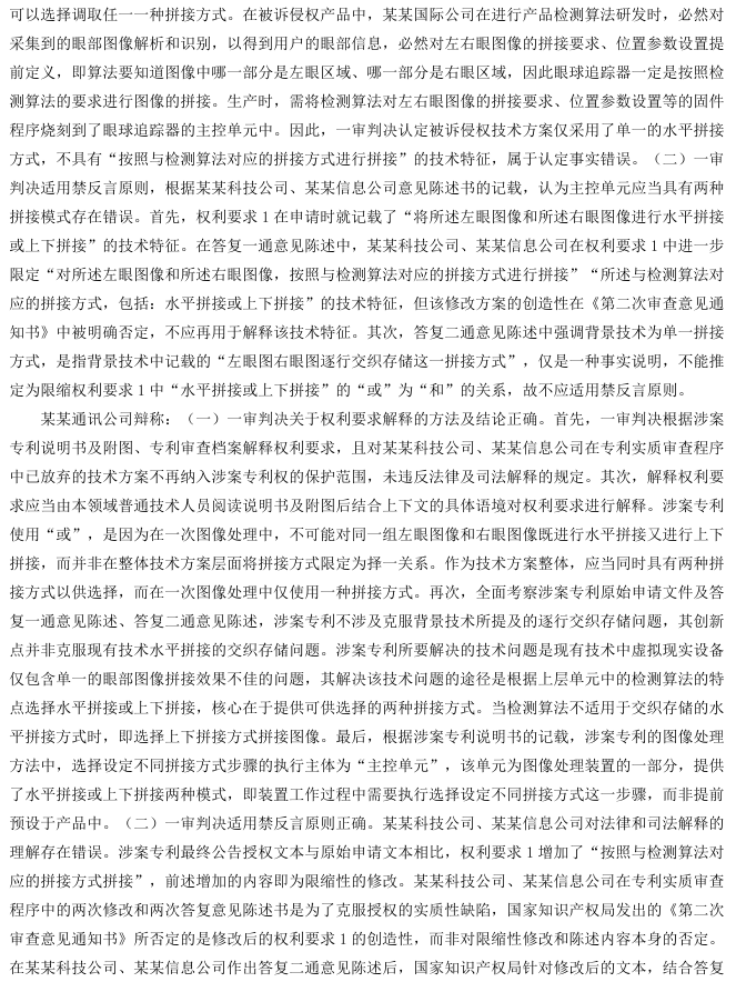 最高人民法院经审理认定,首先,关于“禁止反悔原则”的适用,某某科技公司、某某信息公司在涉案专利的实质审查阶段,为克服创造性缺陷,对权利要求作出了限缩性修改,并明确陈述“单一的眼部图像拼接方式才是本领域的常规操作”。该修改和陈述是为了获得授权而放弃的保护内容,在侵权诉讼中不得再行主张。一审法院适用该原则正确。