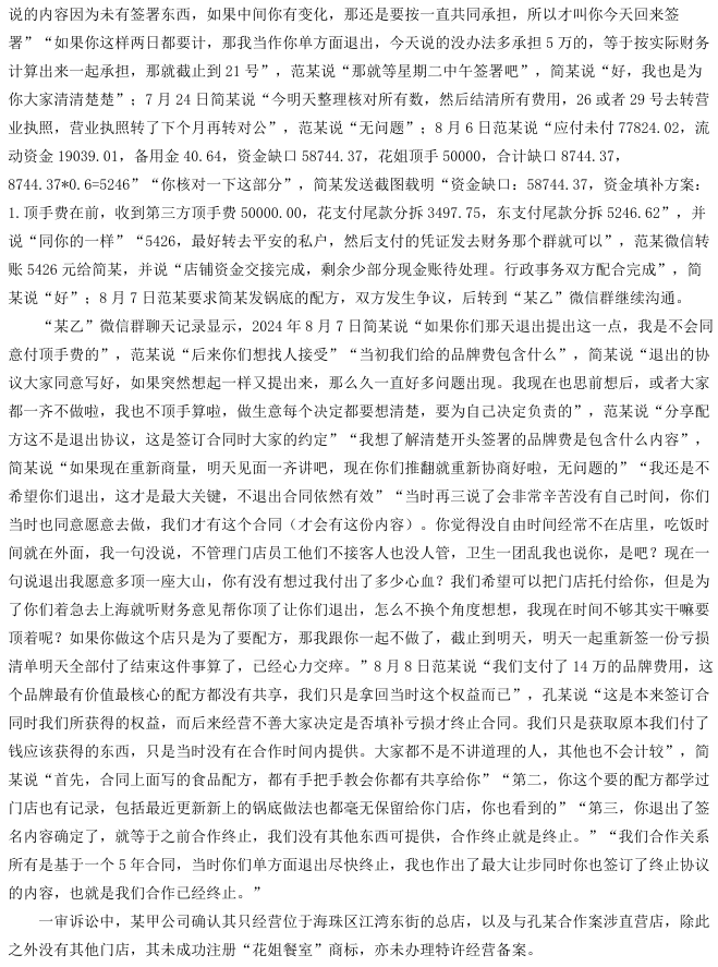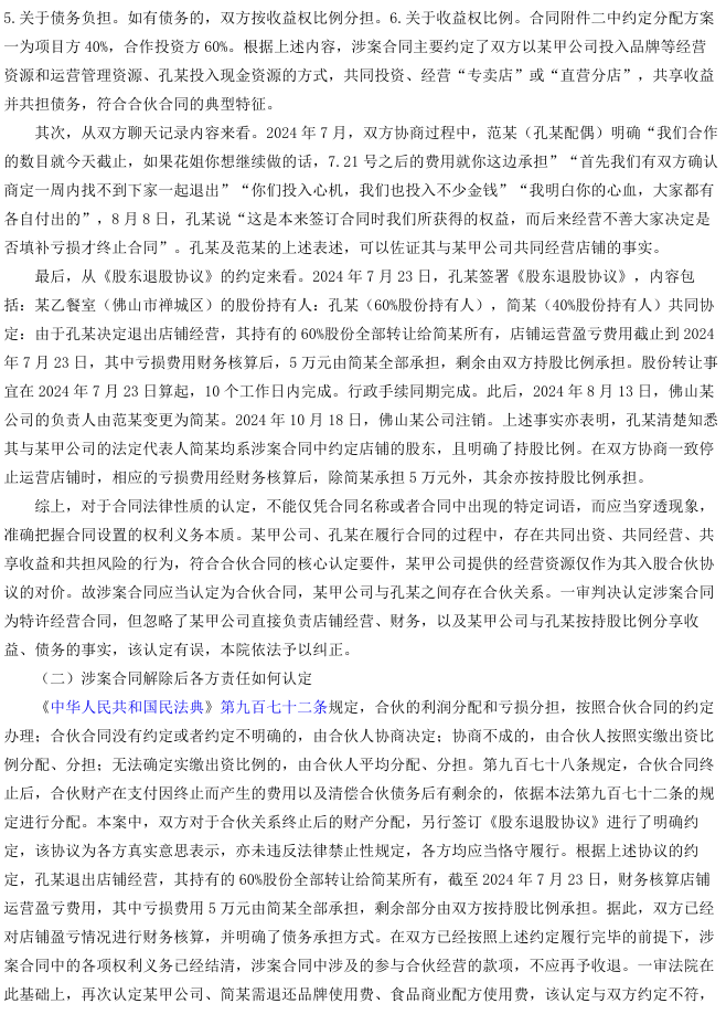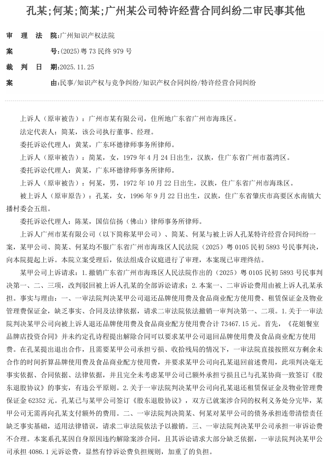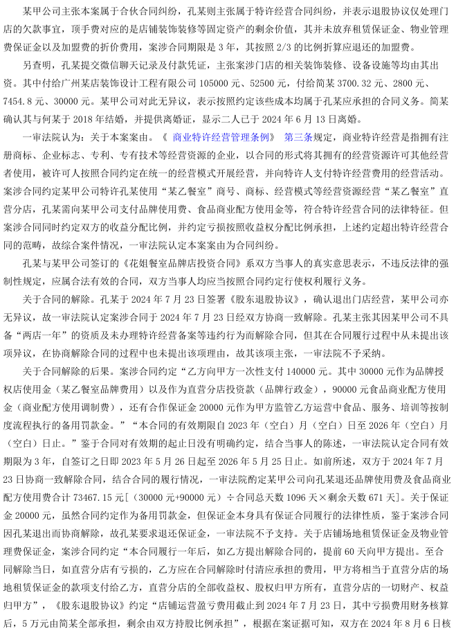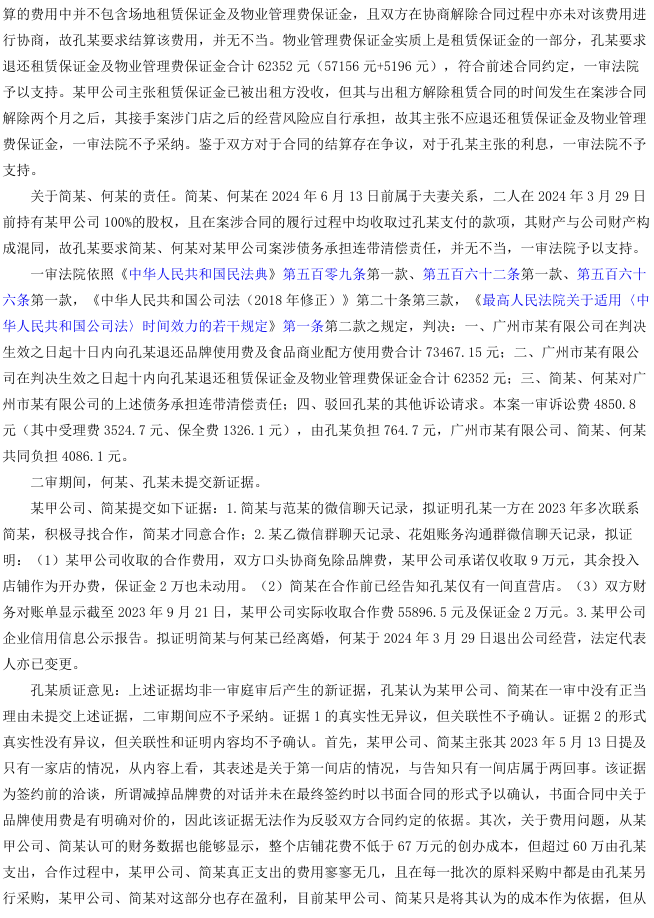 2025年11月25日广州知识产权法院就合同纠纷做出终审判决:双方合同名为特许经营投资,实为合伙关系,退股协议已作盈亏清算,品牌及配方费用属合伙投入不再返还;租赁及物业保证金未纳入清算,依据性质仍应退还;夫妻股东财产与公司混同,依法承担连带责任。最终,改判部分支持保证金返还,维持股东连带责任,驳回其余诉请。