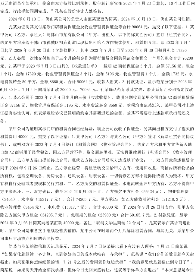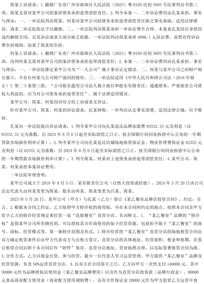 孔某与广州市某有限公司(简称“某甲公司”)签订《某乙餐室品牌店投资合同》,约定共同投资经营“花姐餐室”直营分店。合作期间,双方实际共同出资、共同经营、共担盈亏。后孔某退出经营,双方签订《股东退股协议》,明确股权转让、亏损分担等事宜。因某甲公司未返还相关费用,孔某诉至法院,要求返还品牌使用费、食品配方使用费、租赁及物业保证金,并由公司股东简某、何某承担连带责任。