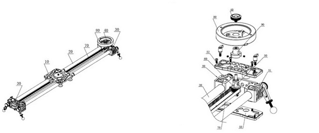 本专利的新型摄像导轨(独立权利要求1),包括有用于固定摄像设备的带安装云台的滑块(10)、两根相互平行的导杆(20)以及两个导杆固定座(30),所述的两导杆的两端分别固定在两个导杆固定座上,所述的滑块通过设在其下方的滑行结构夹持在两导杆上并在两导杆上滑行,其特征在于,在所述的两个导杆固定座中分别设有一个旋转轴(50),在所述的旋转轴中设有同步轮(60),在所述的两导杆之间设有与导杆平行的同步带(70),所述同步带的一端固定在滑块的一侧,其另一端依次绕过两旋转轴上的同步轮后固定在滑块的另一侧;其中一个旋转轴的上端头部伸出导杆固定座的上方并固定连接有一个飞轮(80)。