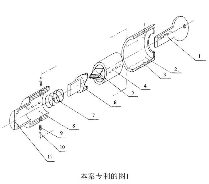 本案专利共包括7项权利要求,其中,独立权利要求1为:“一种空转锁的装置:包含钥匙(1)、锁芯(4)、锁体(8),其特征是,所述锁芯(4)的一端供钥匙(1)插入,另一端设有旋转推进器(5),伸缩联动器(6)一端与旋转推进器(5)相邻,另一端设有伸缩杆,锁体(8)一端或锁体(8)外圆设有供伸缩联动器(6)向外伸出的通道(11),锁体(8)的外圆与外壳(2)的内圆之间装有阻尼弹簧(9)和定位钢球(10)或阻尼弹片(12)和定位凸台(13)。”;从属权利要求6为:“根据权利要求1所述的一种空转锁的装置,其特征是,所述旋转推进器(5)设有凸轮轴,伸缩联动器(6)为圆柱形或多边形柱体。”。