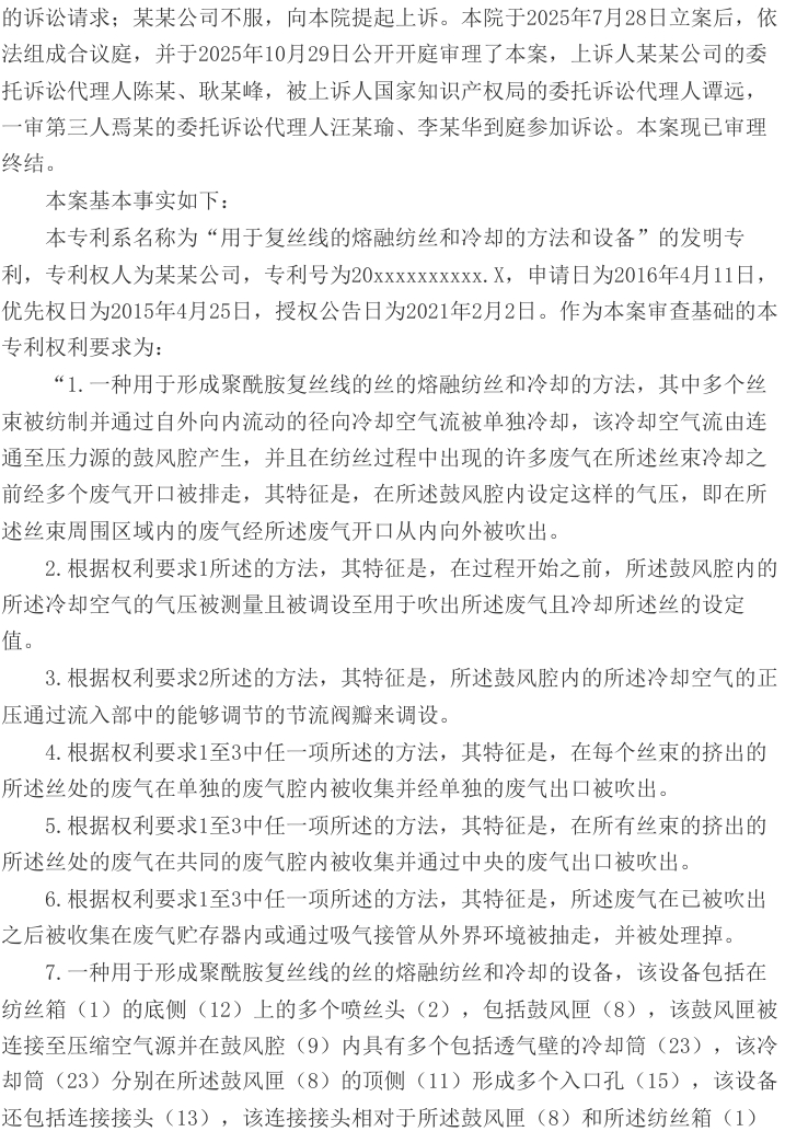 2025年11月24日,最高人民法院就专利无效行政纠纷作出终审判决: 被诉专利“用于复丝线的熔融纺丝和冷却的方法和设备”在证据1(DE102013012869A1)的基础上,结合本领域公知常识(《化纤厂空气调节》《化纤设备》等),其权利要求1所要保护的技术方案对本领域技术人员而言是显而易见的,不具备创造性。鉴于专利权人某某公司亦确认在权利要求1不具备创造性的前提下,不再坚持其他权利要求的创造性,因此被诉决定及一审判决宣告本专利权全部无效并无不当。最终,最高人民法院驳回上诉,维持原判。