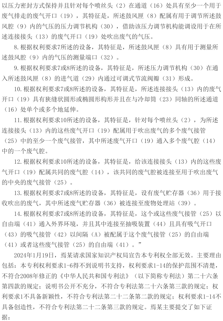 最高院认定, 证据1公开了通过抽吸装置负压排出废气的技术方案,但该抽吸装置会影响冷却气流的稳定性,进而影响丝条均匀性。公知常识证据已明确,保持冷却气流稳定是保证丝条质量的基本要求,并教导了可通过在吹风头内形成正压使气流从上端吹出的技术手段。因此,本领域技术人员在面对提高丝条均匀性的技术问题时,有动机移除证据1中的抽吸装置,并通过调整鼓风腔气压使废气从内向外吹出,该技术效果是可预料的。被诉决定和一审判决关于本专利权利要求1不具备创造性的认定正确。鉴于某某公司对权利要求1不具备创造性无异议后,不再坚持其他权利要求的创造性,故对其他权利要求的无效认定予以确认。最终,最高院驳回上诉,维持原判。