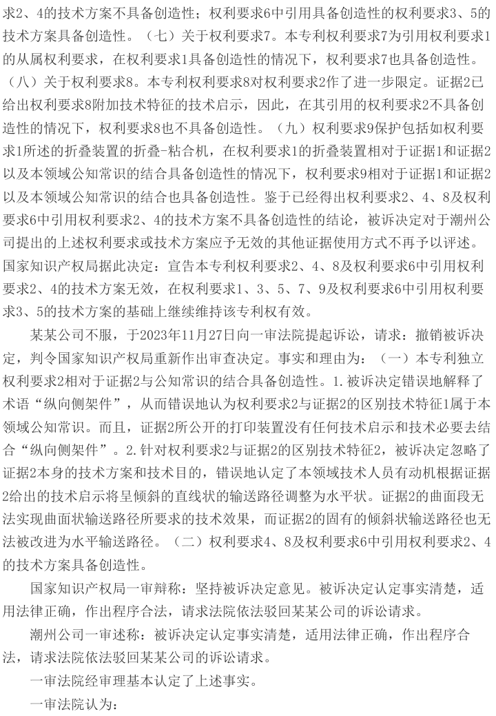 某某公司不服,向北京知识产权法院提起诉讼,请求撤销被诉决定。一审法院经审理认为,在证据1的基础上结合本领域公知常识,得到本专利权利要求1的技术方案是显而易见的,故权利要求1不具备创造性;在独立权利要求1不具备创造性的前提下,从属权利要求及另一独立权利要求7亦不具备创造性。据此,一审法院判决驳回某某公司的诉讼请求。