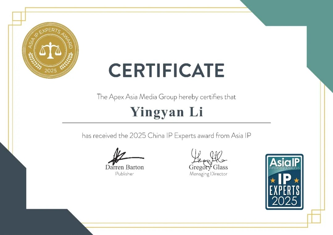 喜讯!国际权威知识产权期刊《亚洲知识产权》(Asia IP)公布 2025 年度中国百强知识产权专家评选结果,钲霖知产所长李英艳女士荣耀入选,并摘得2025中国知识产权专家奖!