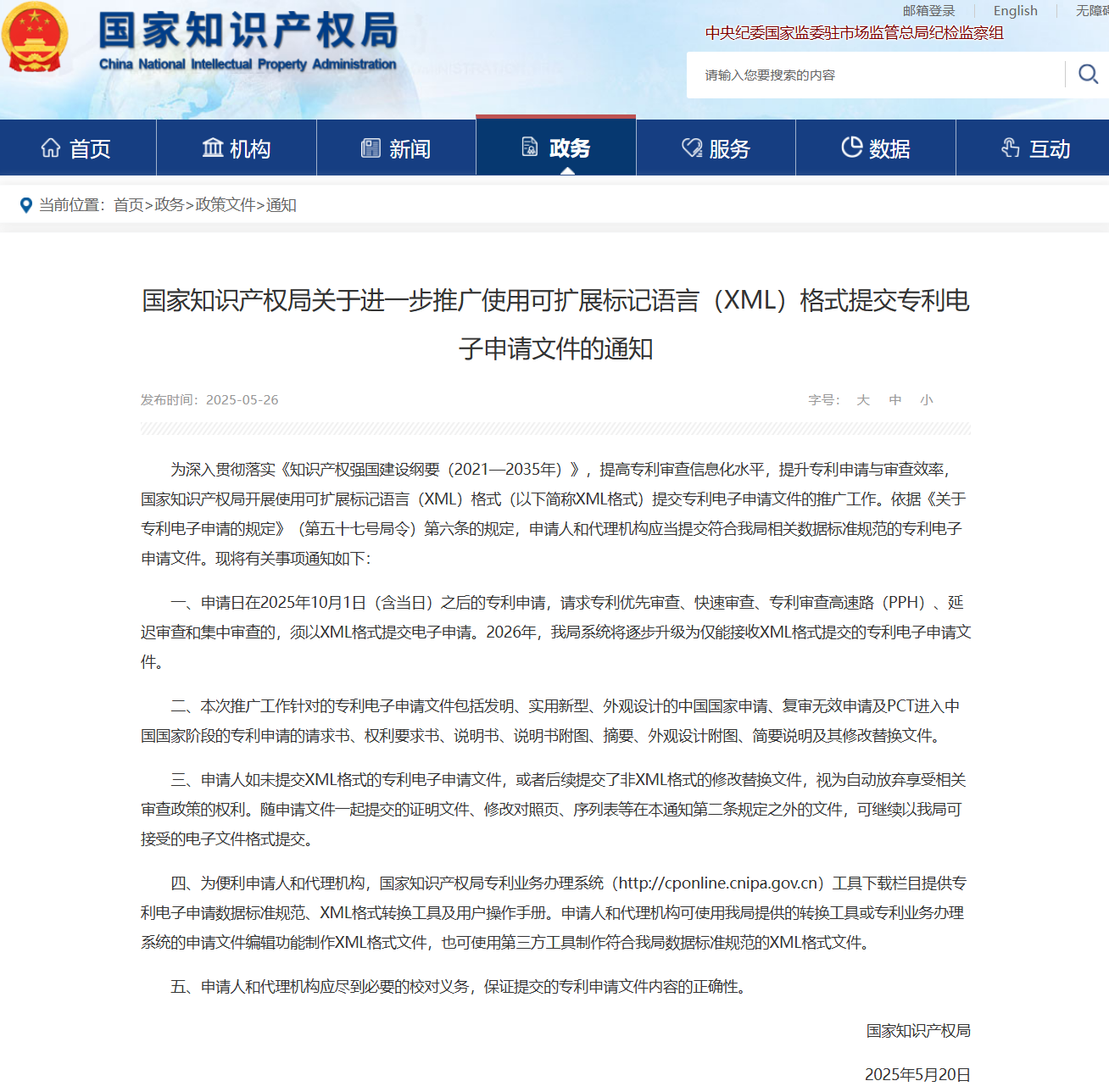 一、申请日在2025年10月1日(含当日)之后的专利申请,请求专利优先审查、快速审查、专利审查高速路(PPH)、延迟审查和集中审查的,须以XML格式提交电子申请。2026年,我局系统将逐步升级为仅能接收XML格式提交的专利电子申请文件。
