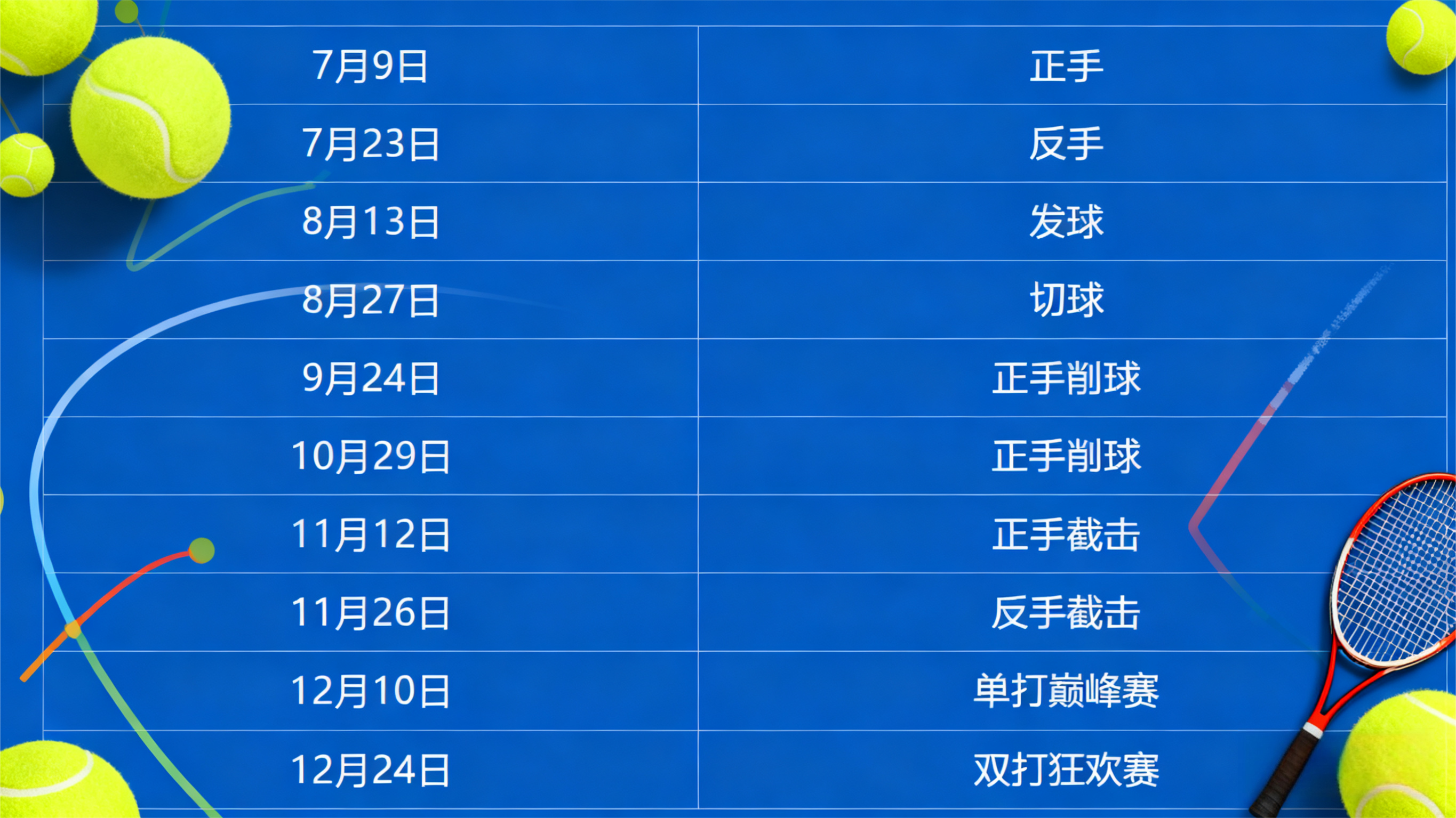 赛事涵盖正手、反手、发球、截击等10项专项技能比拼,自7月至12月逐月开展,每场赛后更新成绩榜单,全程保持竞技悬念与参与热度。